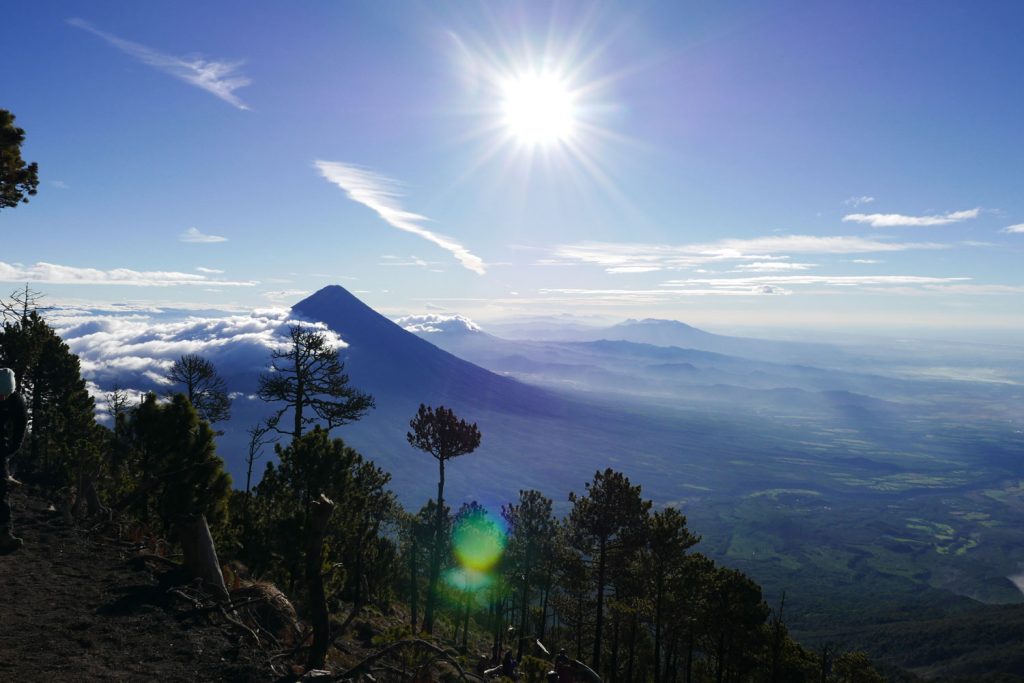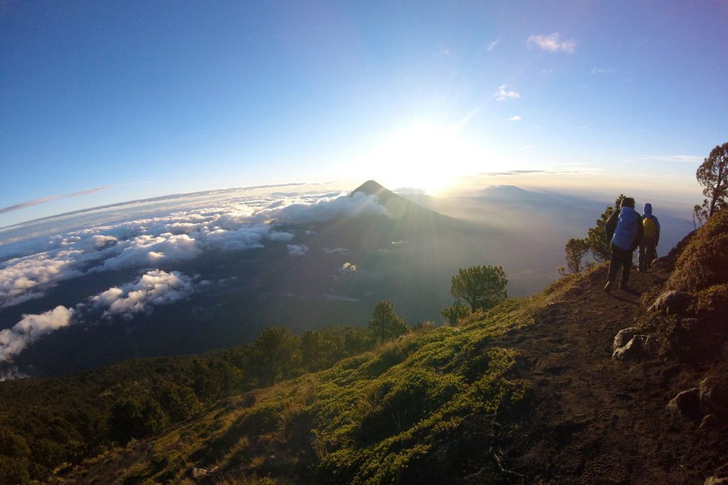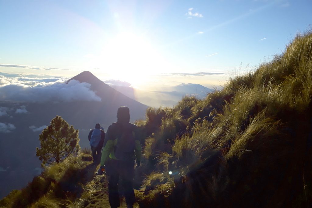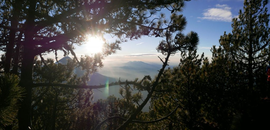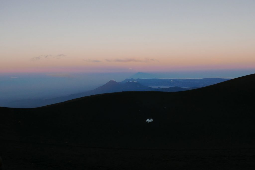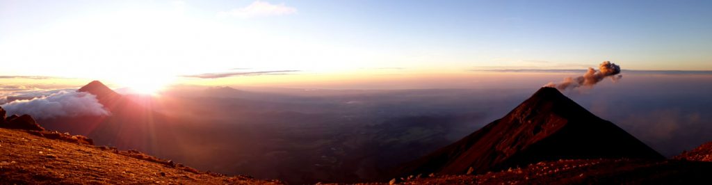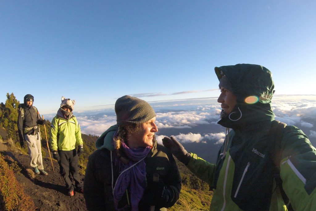 Eine knappe Stunde später ist dieses Naturschauspiel wieder im erneut aufgezogenen Nebel verschwunden – hätten wir nicht ein paar eilig aufgenommene verwackelte Fotos, wären wir wohl nicht sicher, ob dies nur ein Traum gewesen war. Durch diesen kurzen Anblick sind wir so motiviert, dass auch der eineinhalbstündige Anstieg zum Gipfel des Acatenango um halb fünf in der Früh, trotz des erneut aufgekommenen starken Windes und nun auch einsetzenden Regen, rasch vergeht. Und wieder haben wir Glück. Nur wenige Meter vorm Gipfel reißt die Wolkendecke auf und gibt den wunderschönen Blick auf die Landschaft im Sonnenaufgang frei. In unserem Glück merken wir nicht einmal, dass der eisige Wind am Gipfel unsere vom Regen feuchte Außenschicht vereist hat…