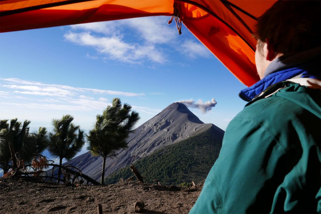 Acatenango Basecamp, Nacht. Plötzlich werden wir von einer heftigen Windböe aus dem Schlaf gerissen. Der Blick springt als erstes nach oben, wo die dort am Zelt als Deckenlicht befestigte Stirnlampe durch den Wind wie ein Pendel hin und her schwingt. Pendelbewegungen, die uns die Präsenz von Zeit vor Augen führt – Zeit die nicht vergehen will, hier in unserem vom Wind gebeutelten Zelt am Acatenango, einem der höchsten Vulkane Mittelamerikas. Irgendwann fallen unsere Augen dann doch wieder zu, mehr aus Erschöpfung ob der fünfstündigen Wanderung die hinter uns liegt als aus Müdigkeit, bis sich das Ganze ein paar Minuten später wiederholt, wieder und wieder – draußen tobt ein Sturm.