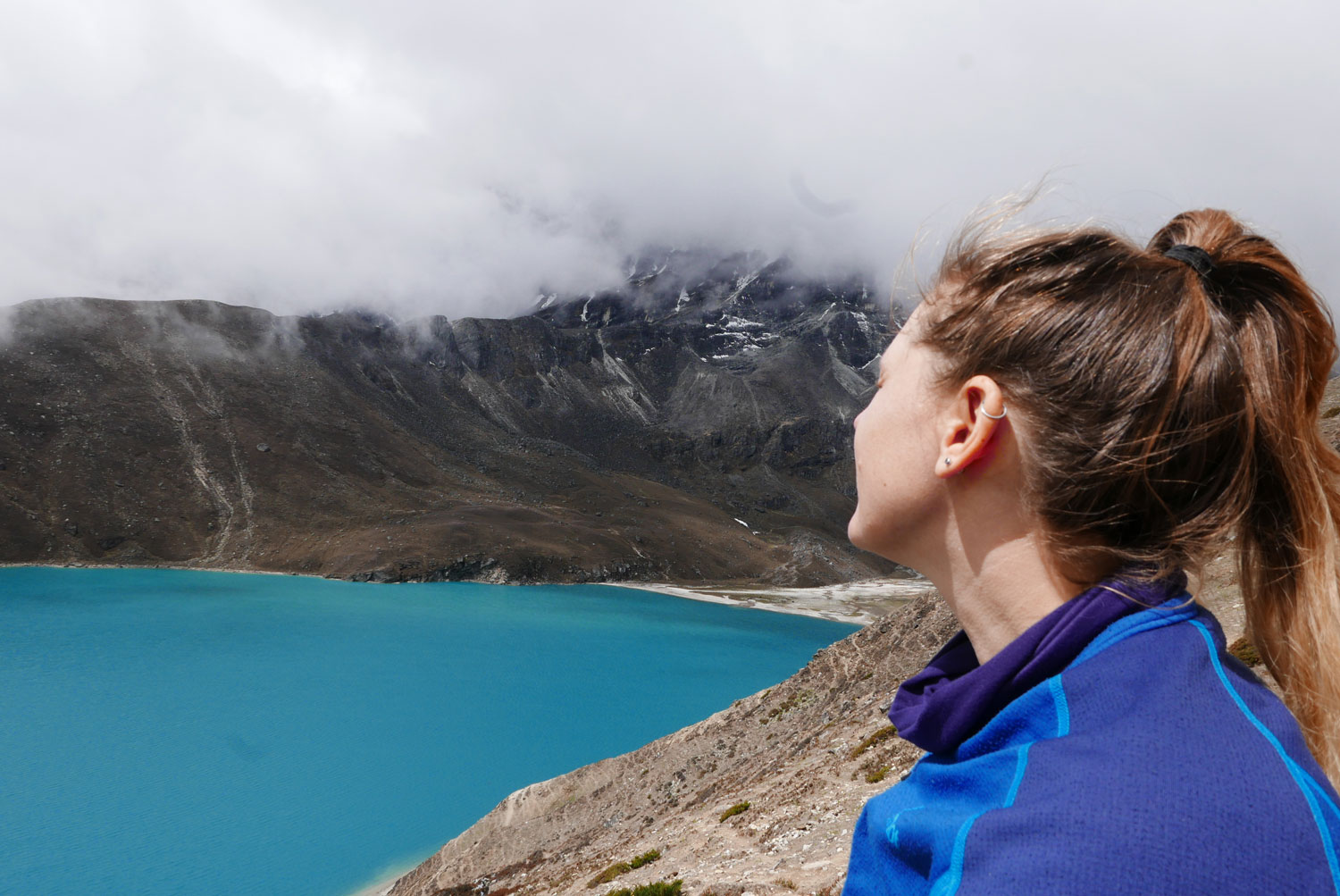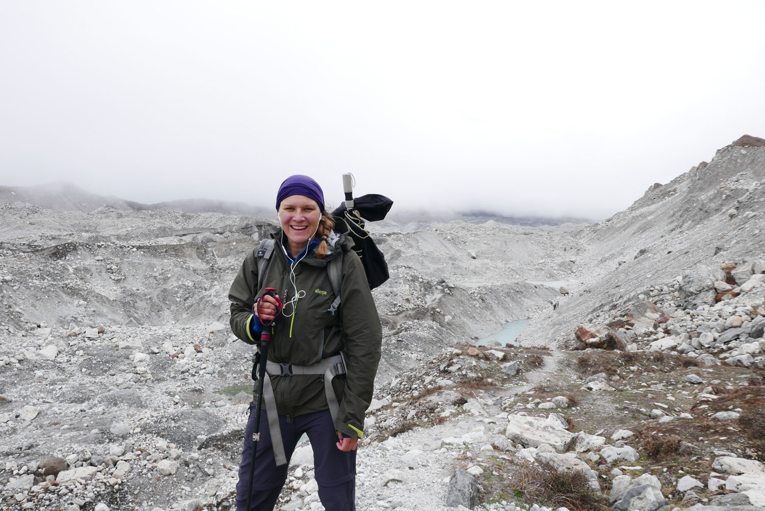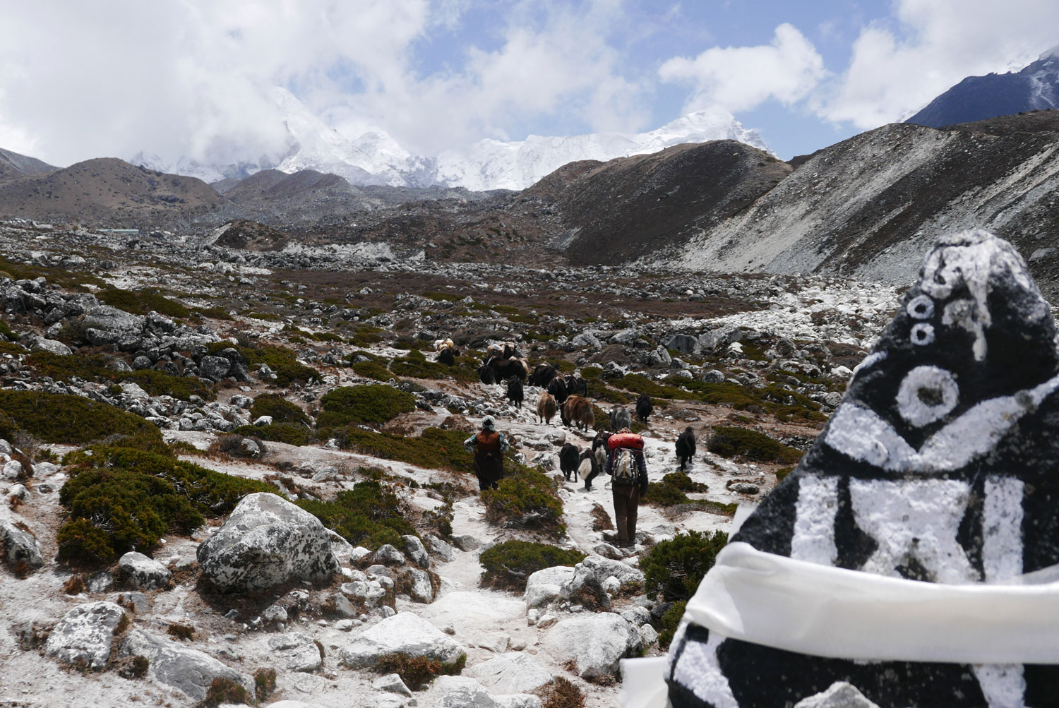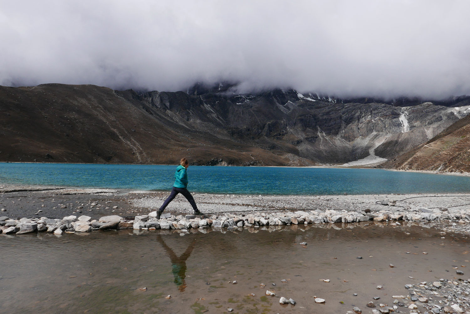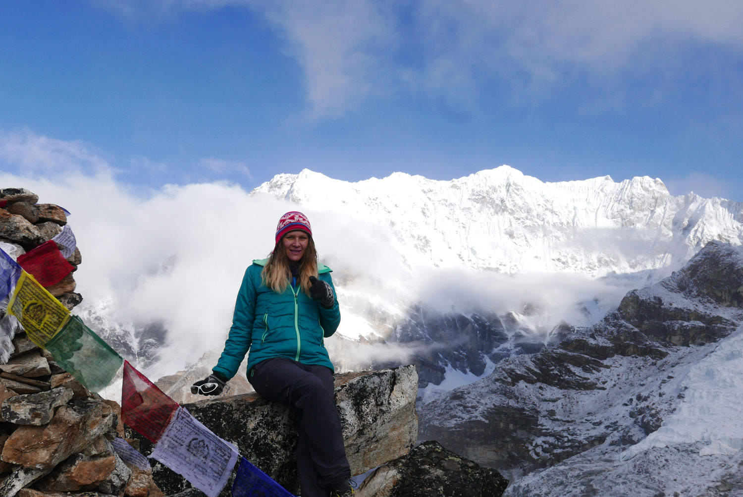 Und weil wir nicht den gleichen Weg zurückgehen wollten, sind wir kurzerhand über den Cho La Pass nach Gokyo abgezweigt. Ein elfstündiger Weg durchs Gebirge auf 5.300 m, völlig verschneit und vereist und zum Abschluss noch quer über den Ngozumpa-Gletscher, den größten Eisstrom Nepals. Belohnt wurden wir und unsere für den Pass spontan gegründete Seilschaft (nein, Seil gabs keins!) mit den Hochgebirgsseen Gokyos und einem wunderschönen Rückweg in die Sherpa-Hauptstadt Namche Bazaar.
