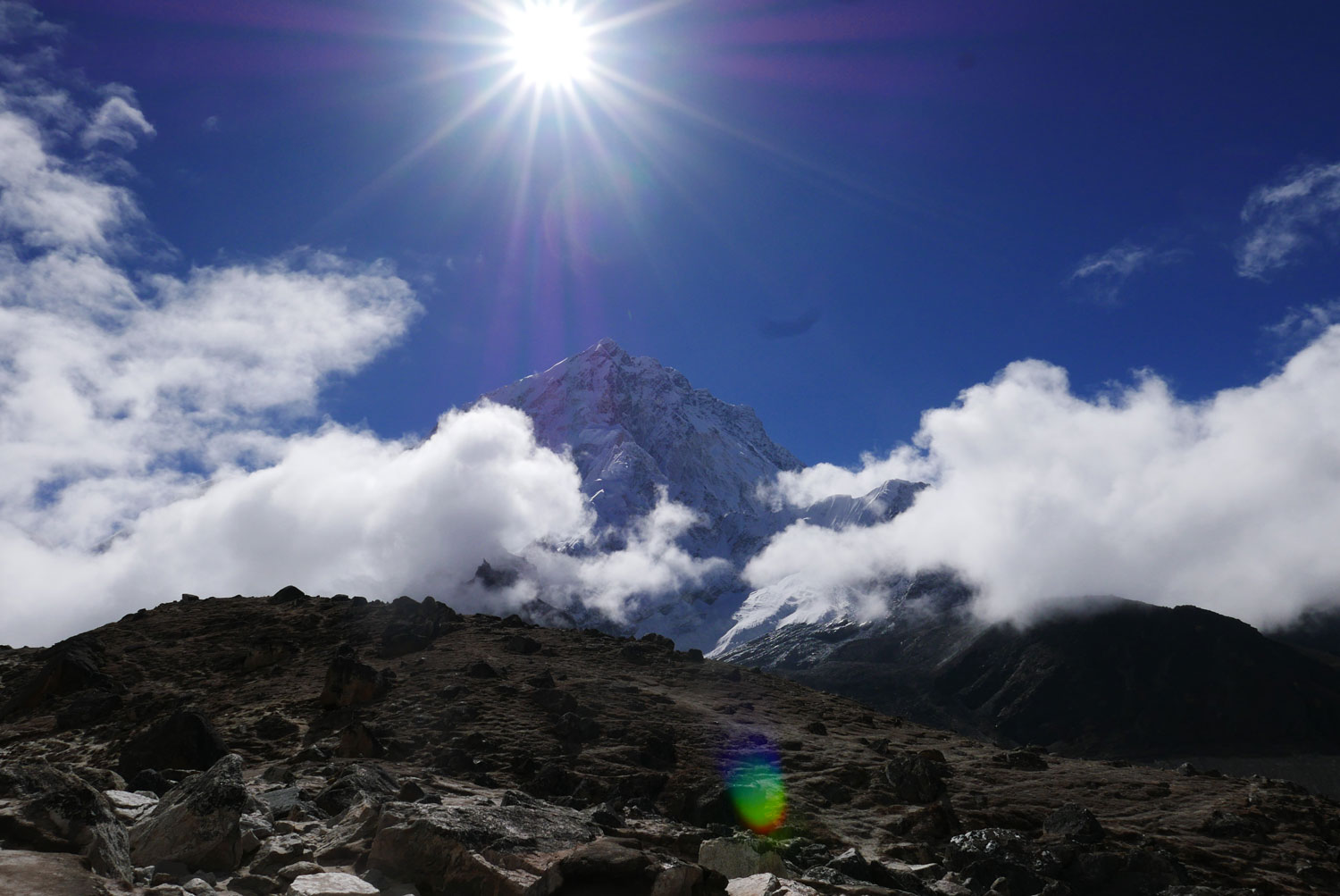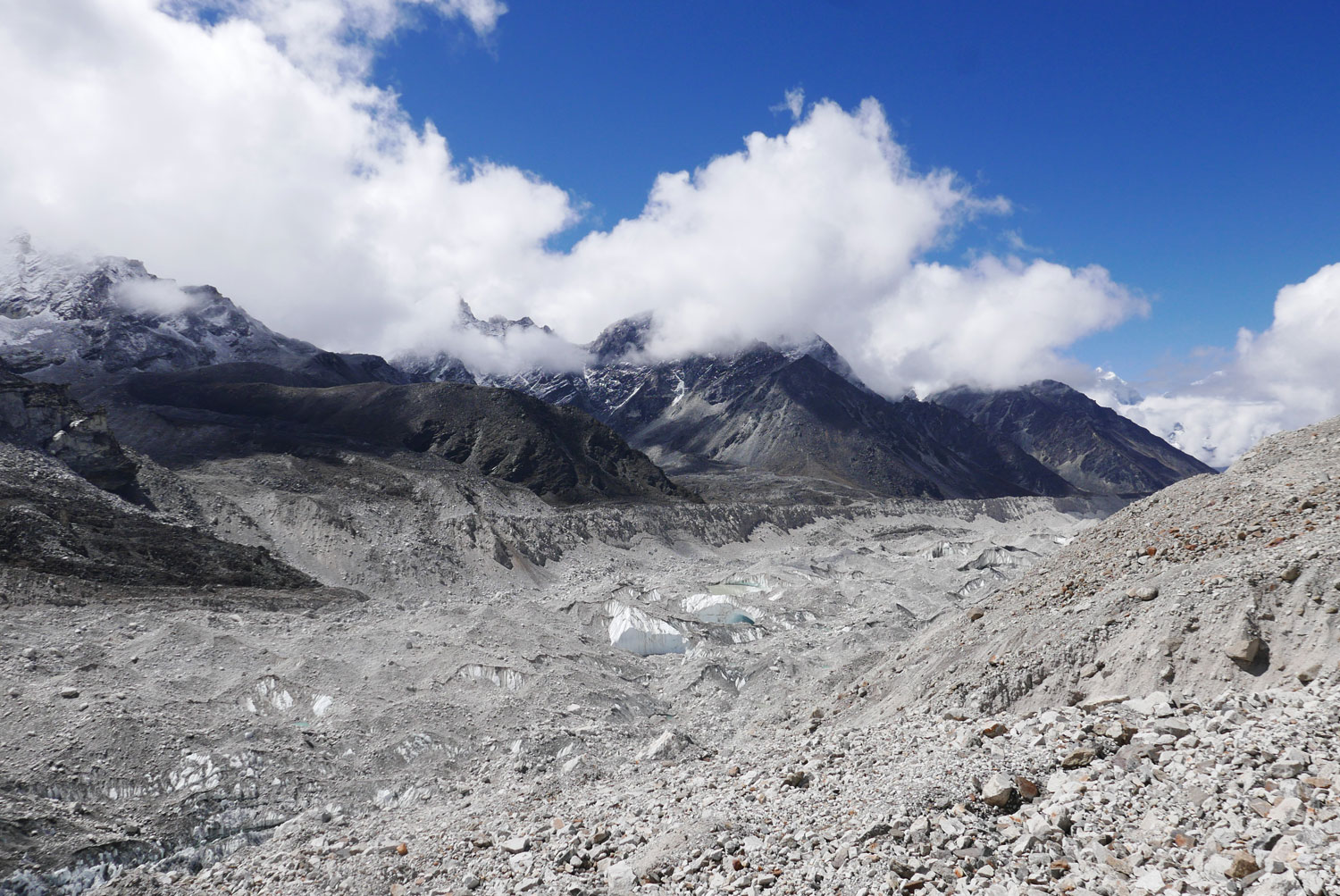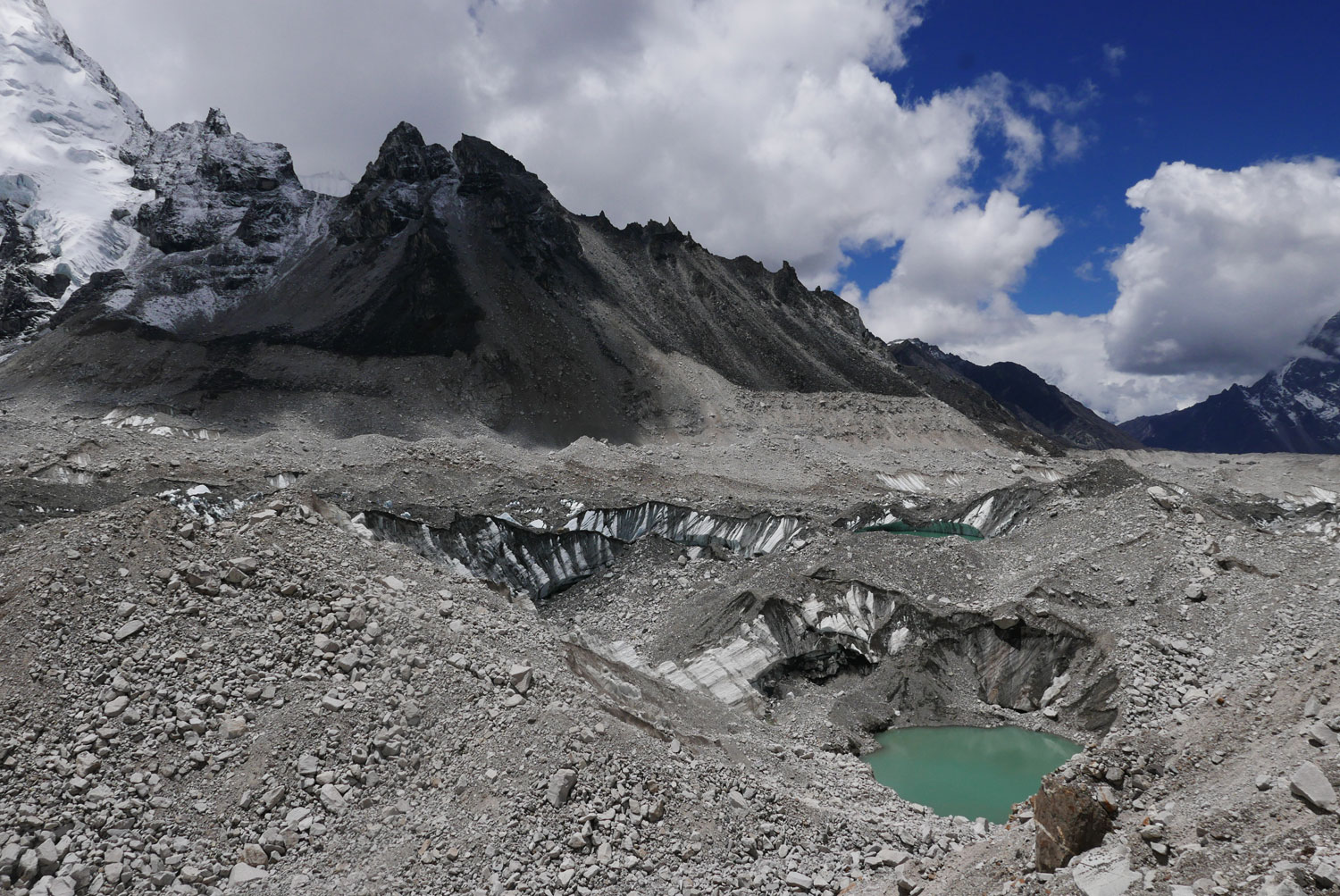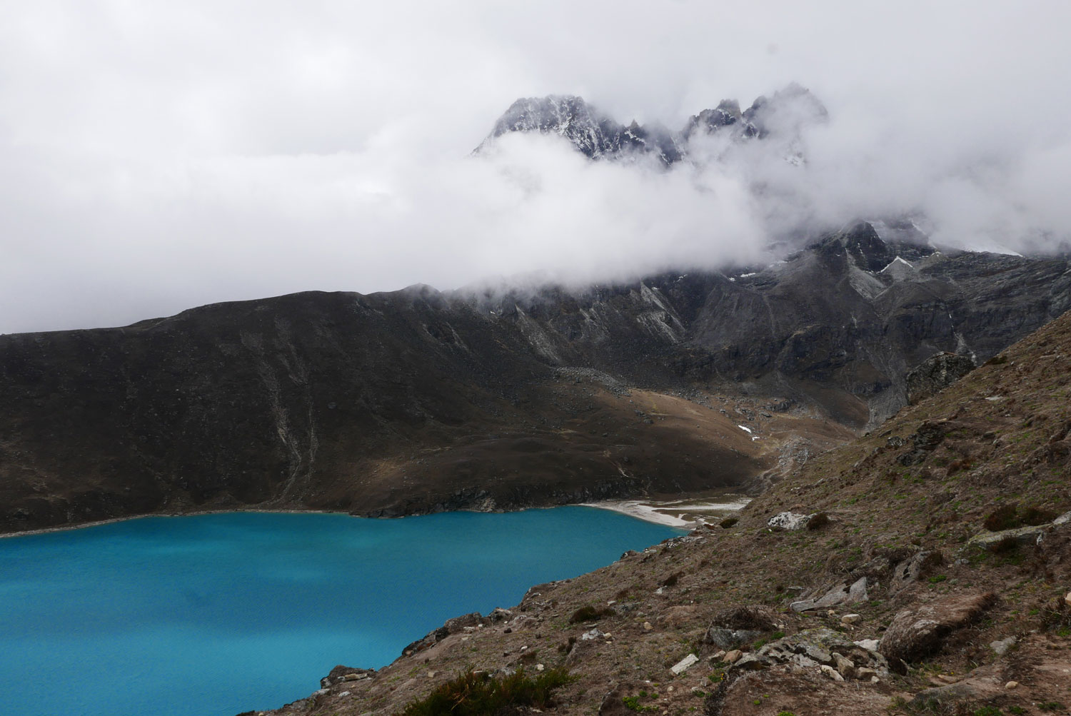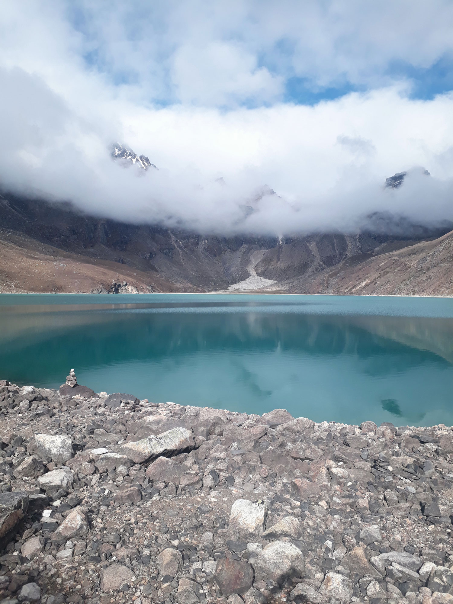Und weil wir nicht den gleichen Weg zurückgehen wollten, sind wir kurzerhand über den Cho La Pass nach Gokyo abgezweigt. Ein elfstündiger Weg durchs Gebirge auf 5.300 m, völlig verschneit und vereist und zum Abschluss noch quer über den Ngozumpa-Gletscher, den größten Eisstrom Nepals. Belohnt wurden wir und unsere für den Pass spontan gegründete Seilschaft (nein, Seil gabs keins!) mit den Hochgebirgsseen Gokyos und einem wunderschönen Rückweg in die Sherpa-Hauptstadt Namche Bazaar.