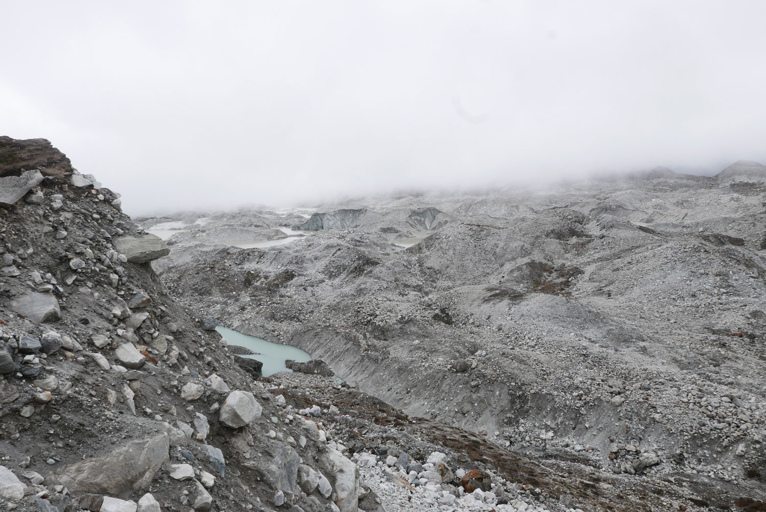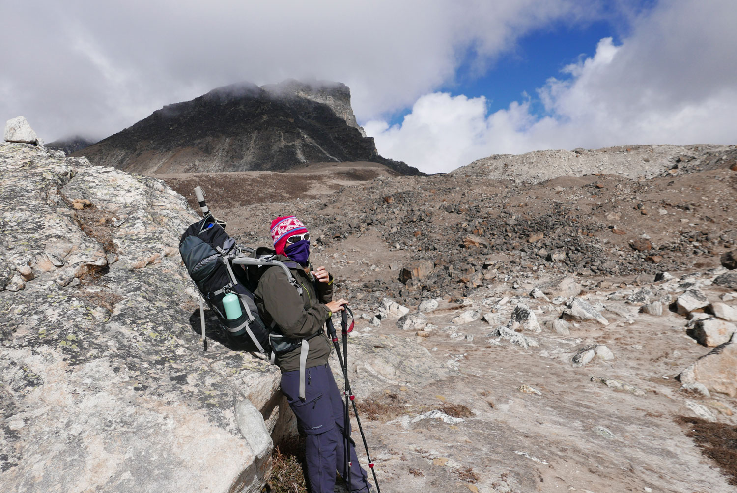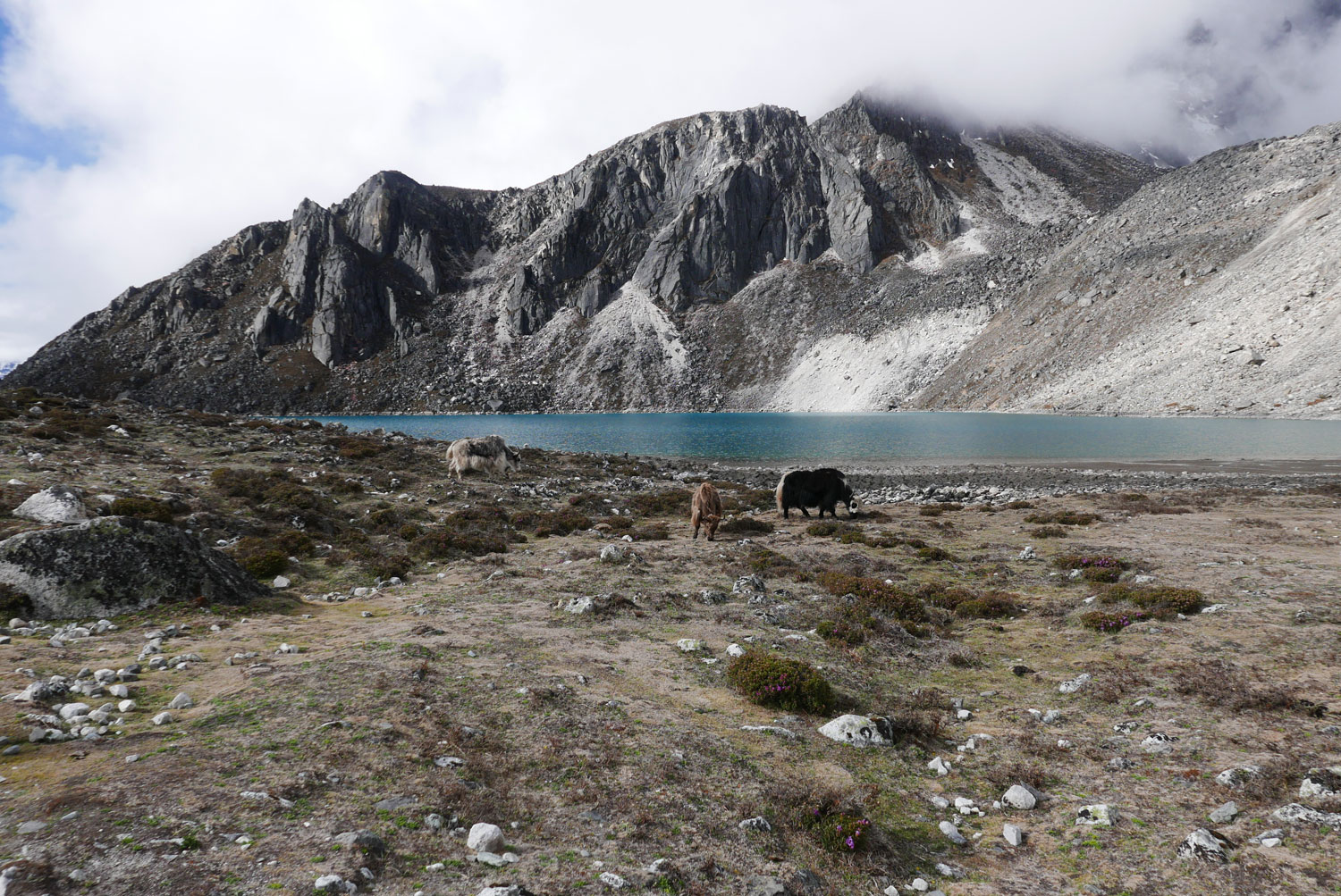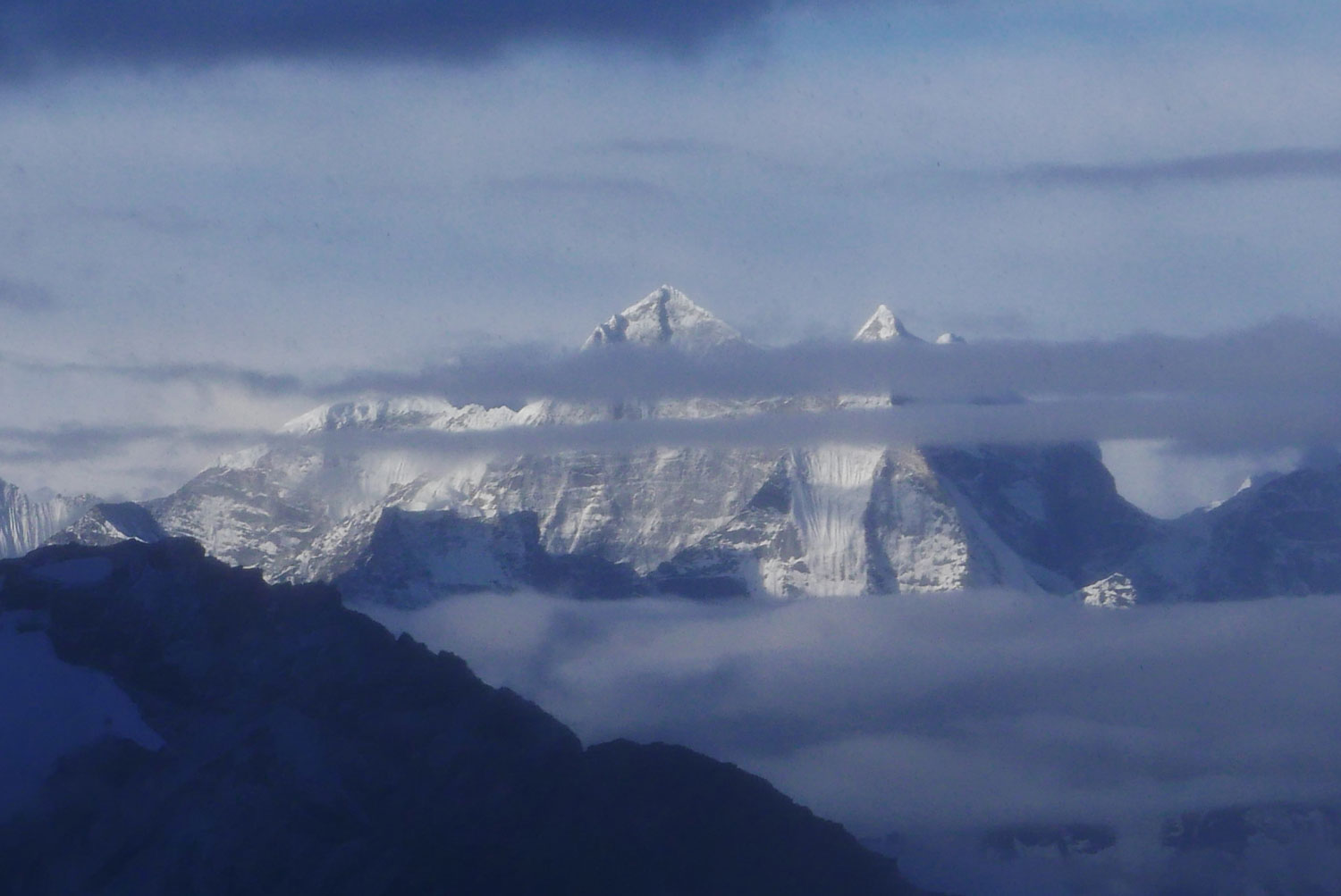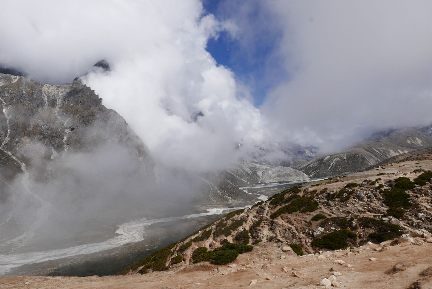 Und weil wir nicht den gleichen Weg zurückgehen wollten, sind wir kurzerhand über den Cho La Pass nach Gokyo abgezweigt. Ein elfstündiger Weg durchs Gebirge auf 5.300 m, völlig verschneit und vereist und zum Abschluss noch quer über den Ngozumpa-Gletscher, den größten Eisstrom Nepals. Belohnt wurden wir und unsere für den Pass spontan gegründete Seilschaft (nein, Seil gabs keins!) mit den Hochgebirgsseen Gokyos und einem wunderschönen Rückweg in die Sherpa-Hauptstadt Namche Bazaar.